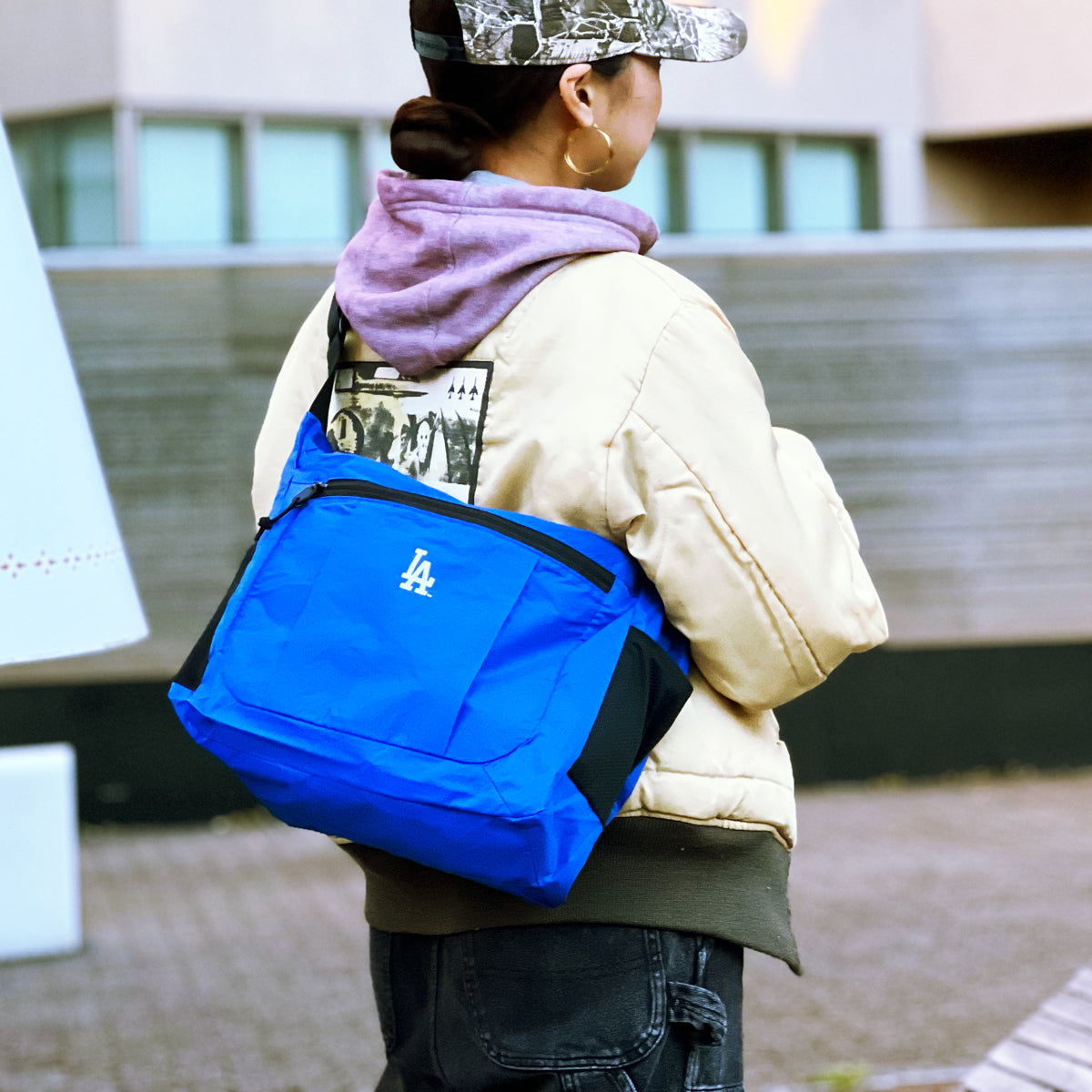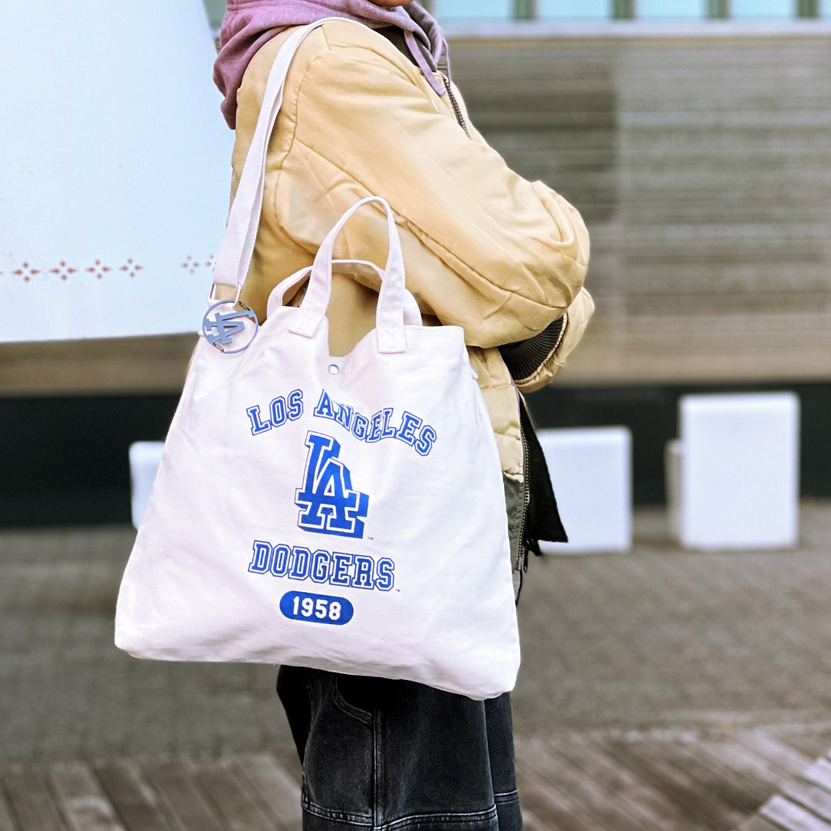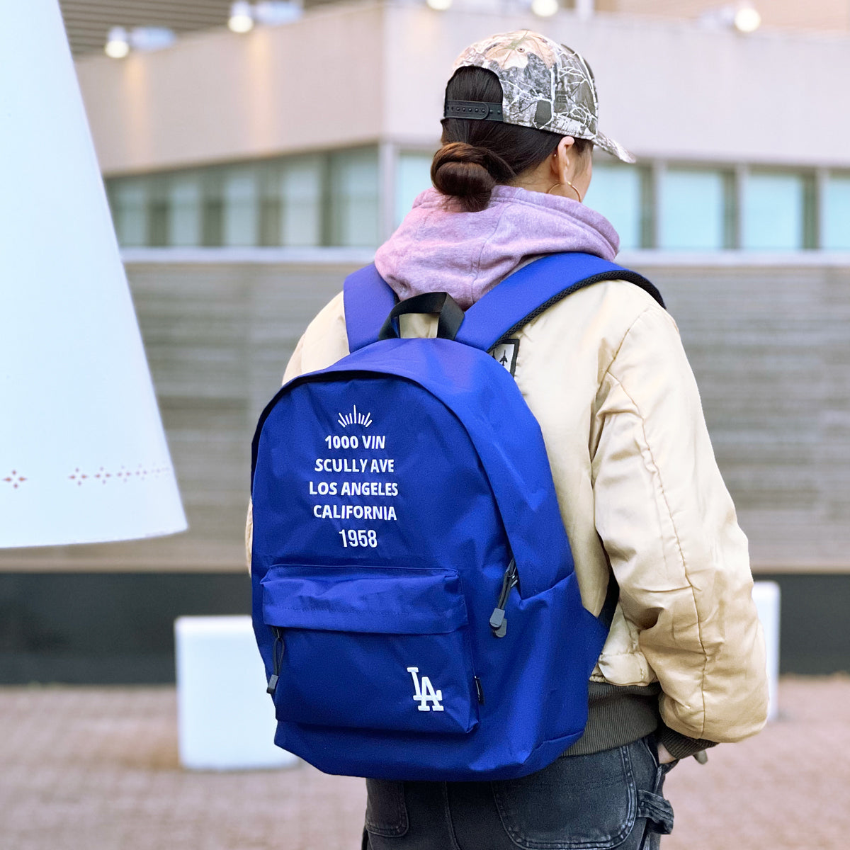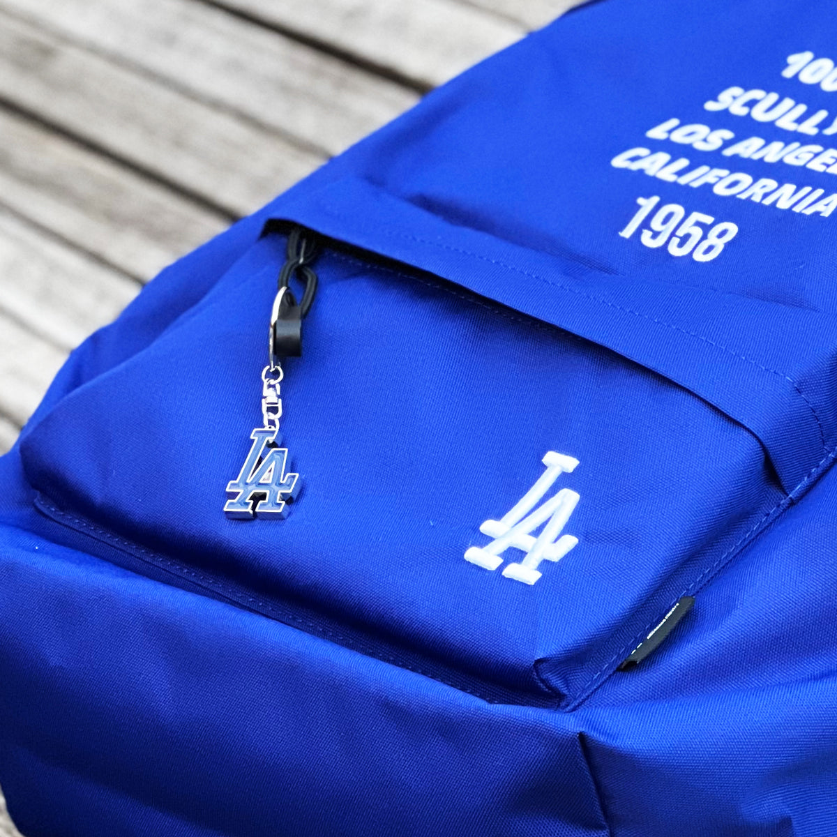 LAのロゴとチームカラーであるドジャーブルーを基調としたシンプルなデザインで、普段使いから旅行や軽い外出までどんな場面でも西海岸を感じさせてくれる。