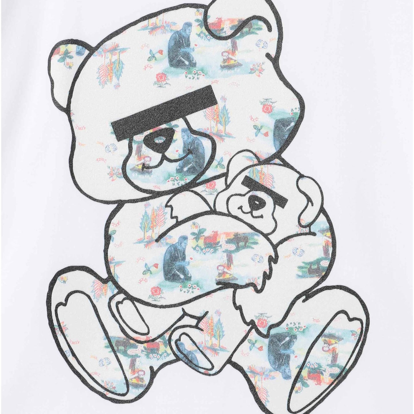 抱きしめるように小さなベアを持つ姿は、どこか哀愁やストーリーを感じさせ、シンプルながら存在感抜群のグラフィックTシャツ。