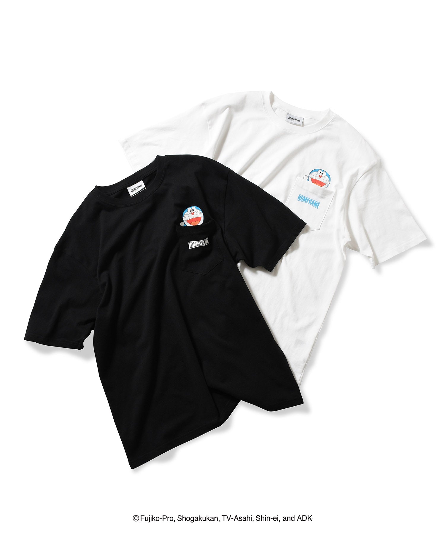 ポケットから顔を覗かせるようにプリントされたドラえもんが特徴で、ポケット上にはHOMEGAMEロゴをプリント。