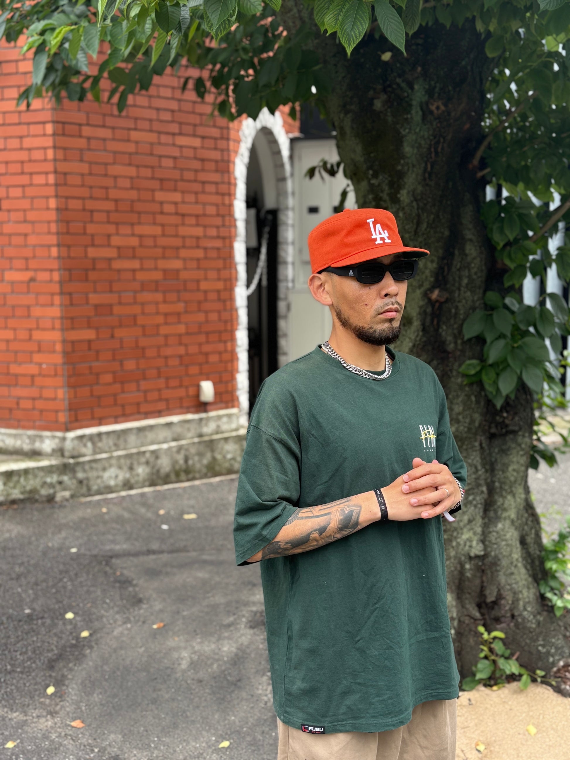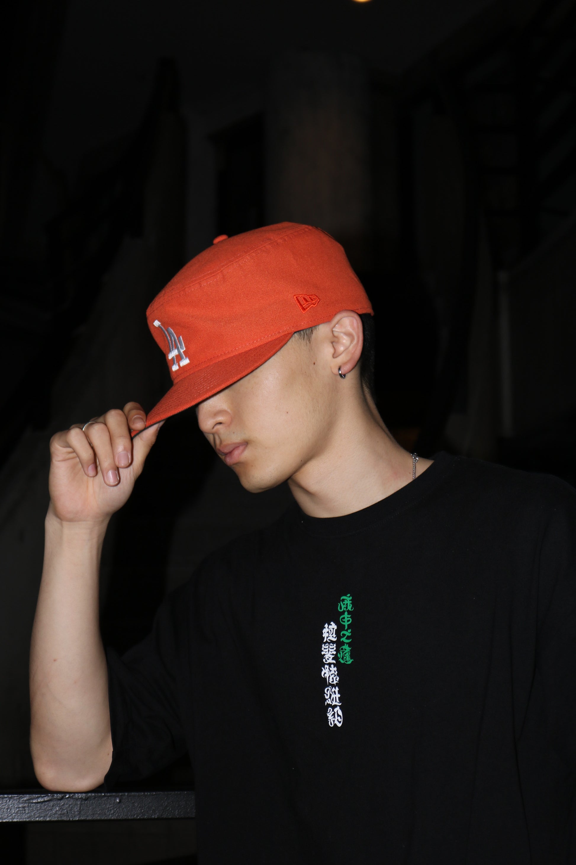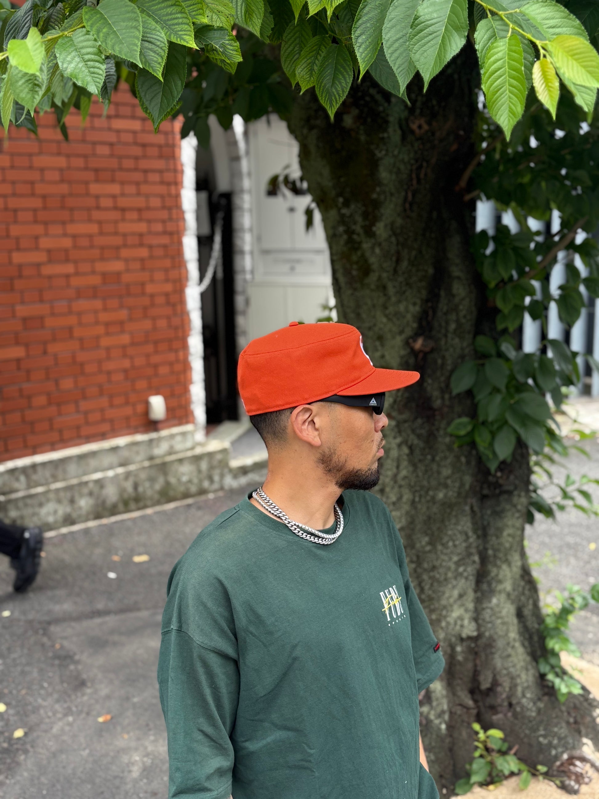 都会的で落ち着きのあるダスティオレンジをベースに、フロントにフラット刺繍でチームロゴを配し、レフトサイドには同色のフラッグロゴを刺繍。