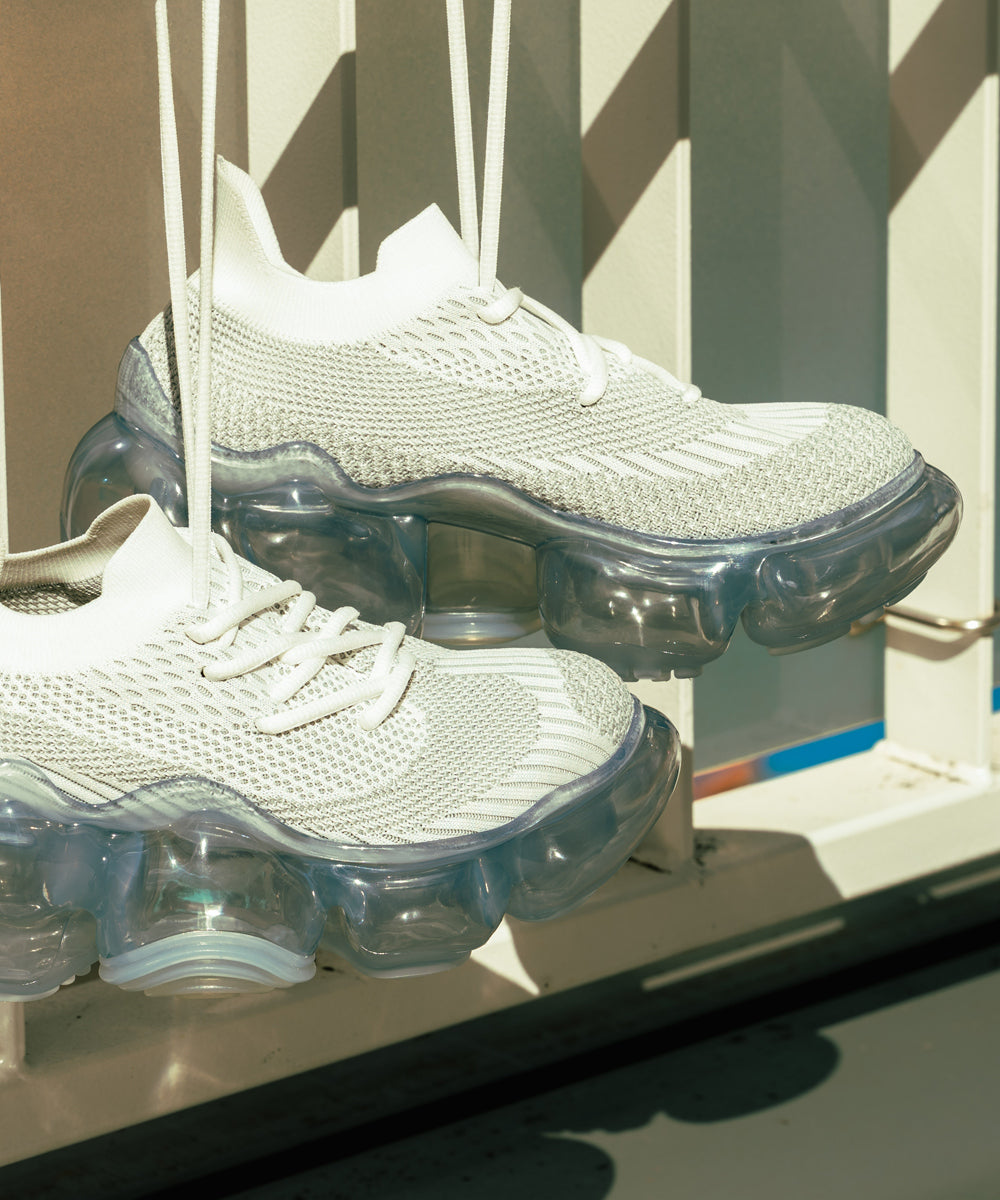 またニットアッパーのアシンメトリーにレイアウトされたシューホールとパターンが抽象的なアウトソールのデザインを引き継いでいる。