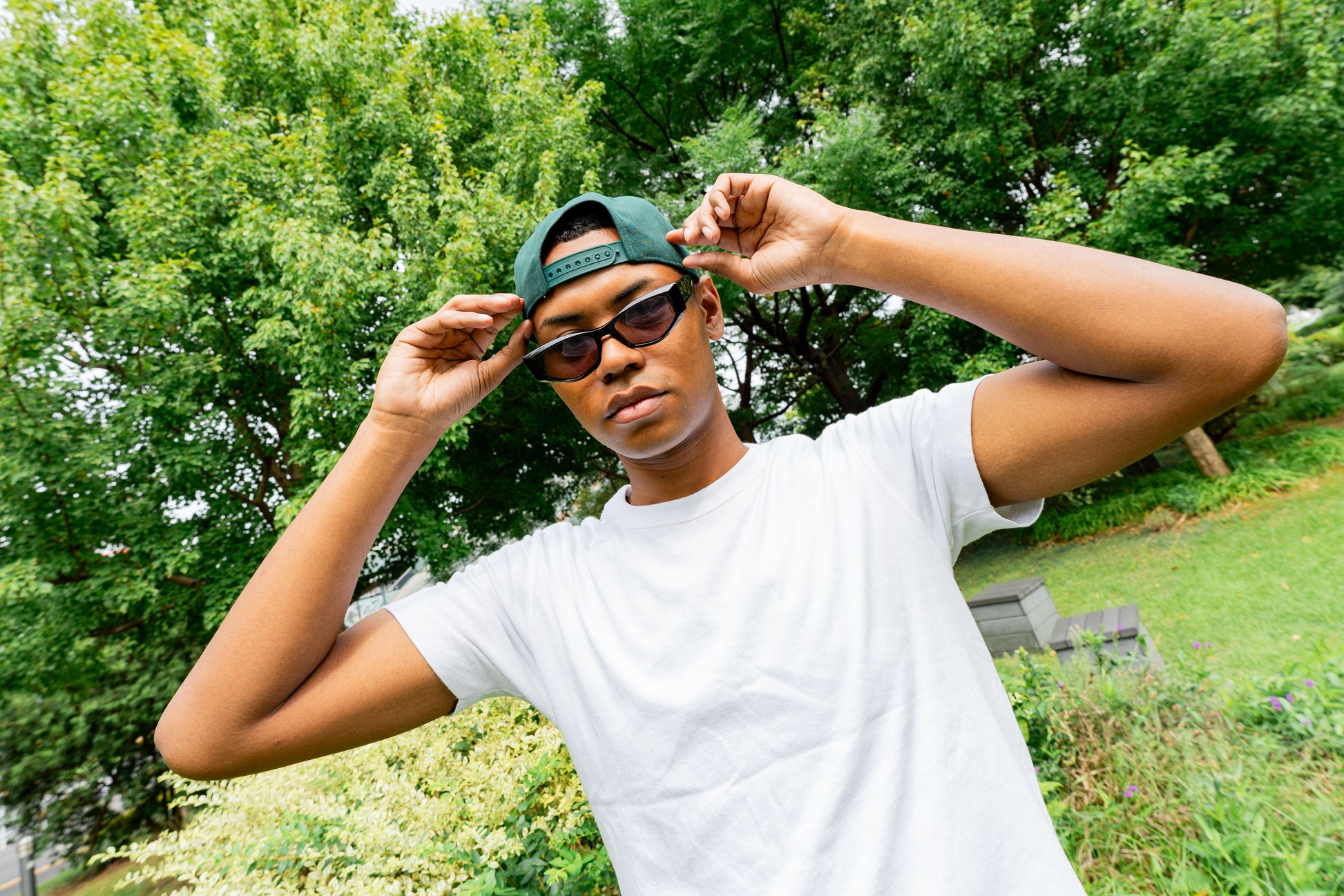 ダークグリーンをメインカラーに、フロントにはスポンジボブのユニークなグラフィックを刺繍。