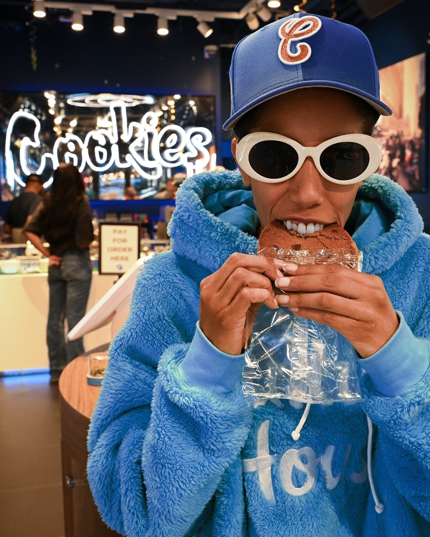 パネルごとに異なるトーンのブルーを配色した存在感のあるキャップ。