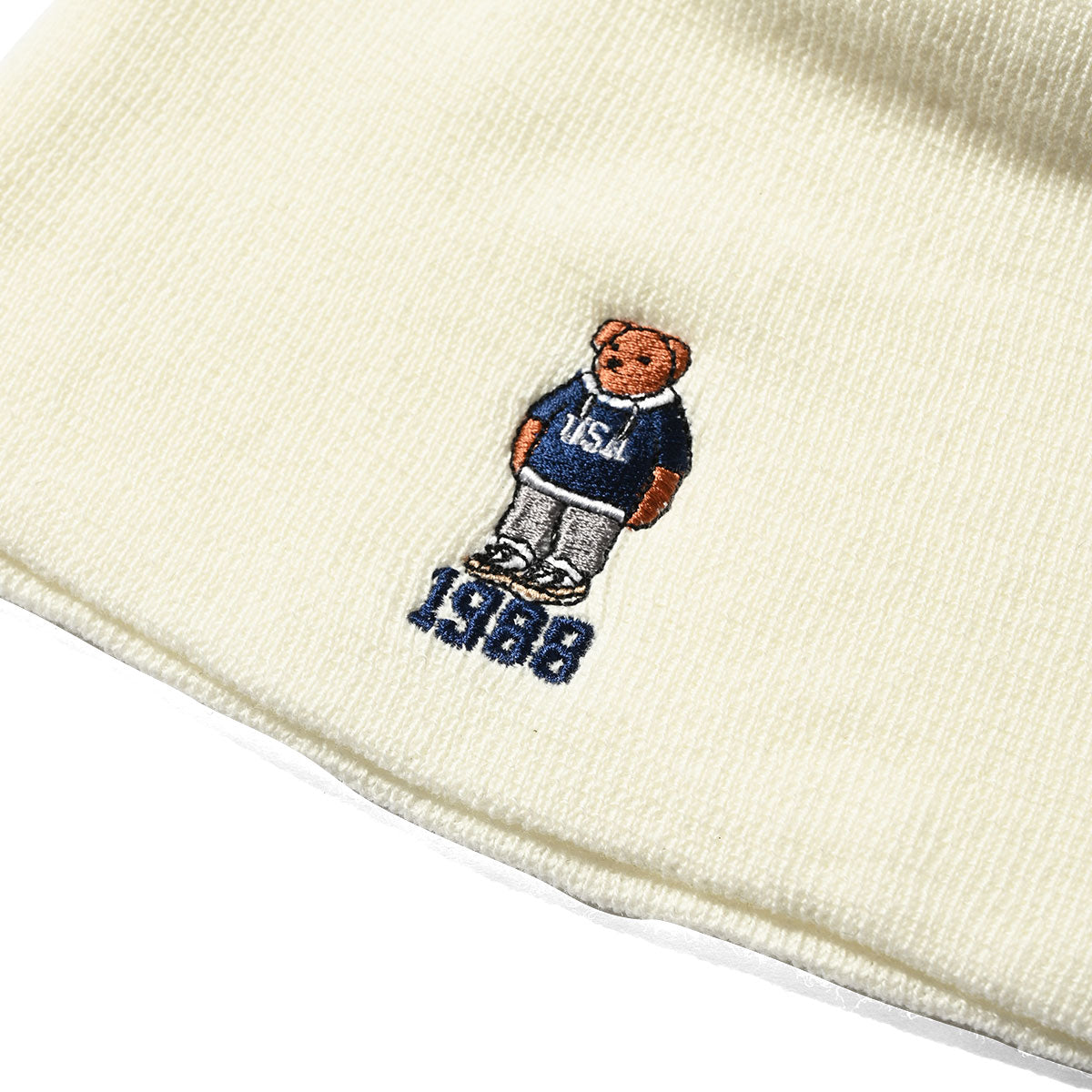 這款毛線帽飾有標誌性熊的刺繡版本。